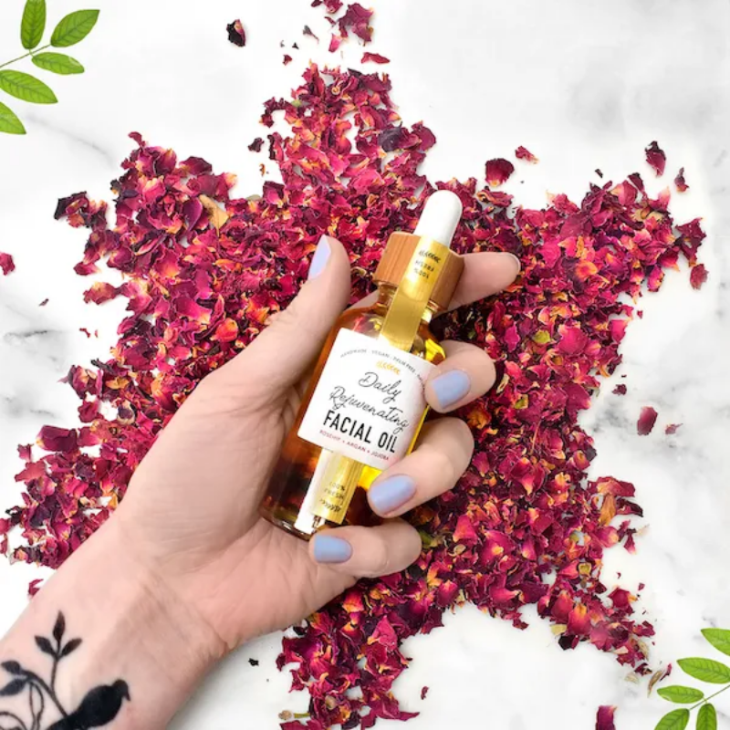 - Rosehip Oil: Hydrates and moisturises. High in vitamins A & C. Reduces inflammation, and the appearance of stretch marks & scars