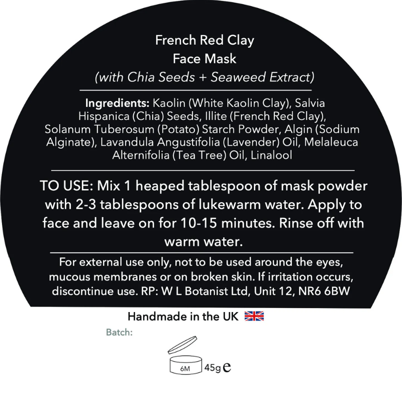 Each red clay face mask is made by hand in the UK. We are an all vegan supplier, which means every item is full of good stuff. Moreover, this face mask is plastic free, with not a drop of palm oil in sight.
